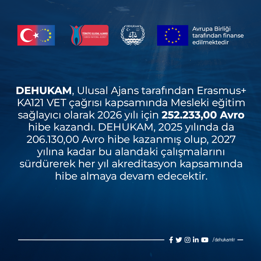 DEHUKAM, Ulusal Ajans tarafından Erasmus+ KA121 VET çağrısı kapsamında Mesleki eğitim sağlayıcı olarak 2026 yılı için 252.233,00 Avro hibe kazandı. DEHUKAM, 2025 yılında da 206.130,00 Avro hibe kazanmış olup, 2027 yılına kadar bu alandaki çalışmalarını sürdürerek her yıl akreditasyon kapsamında hibe almaya devam edecektir.