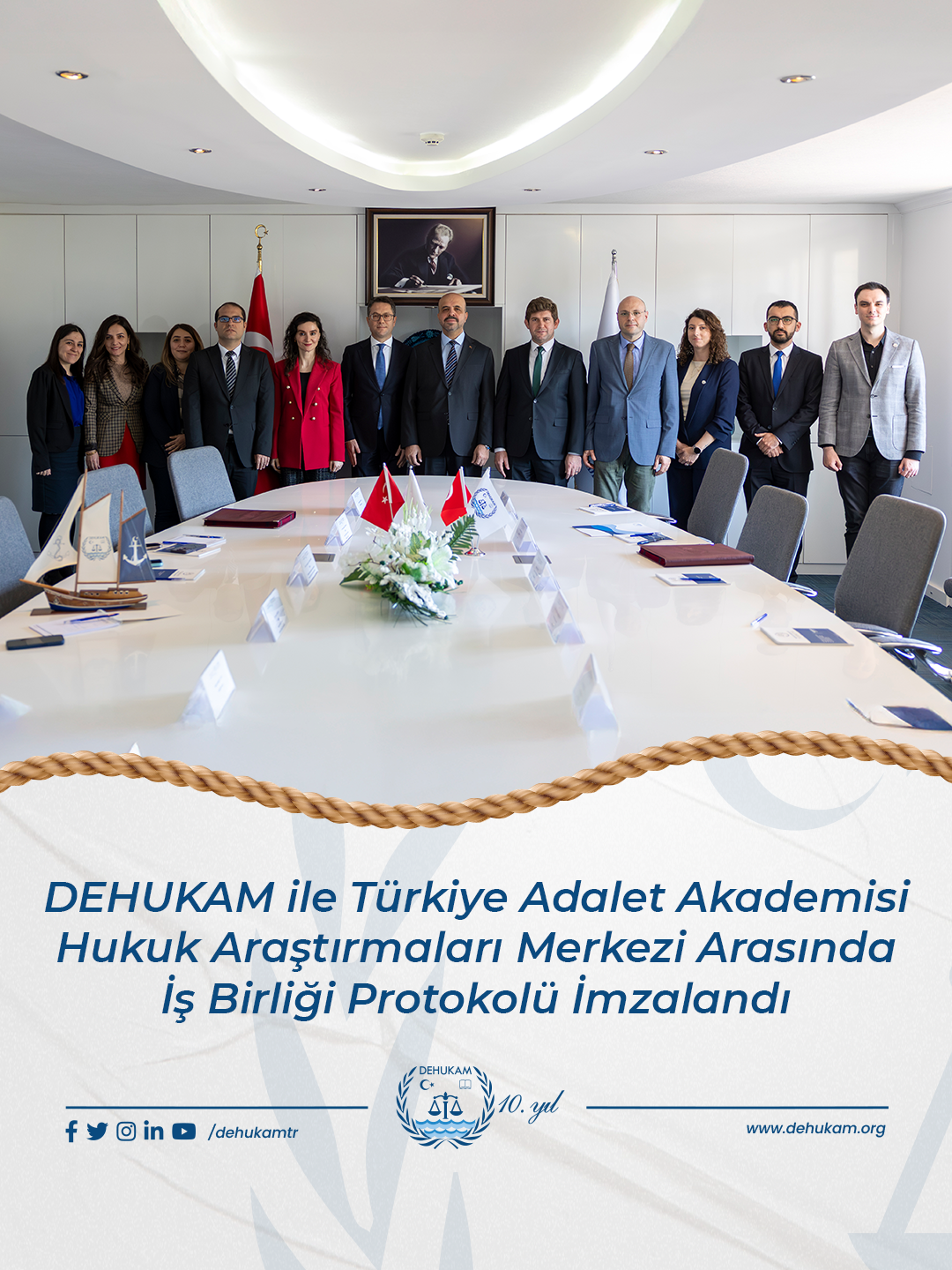 A cooperation protocol in the field of sea and maritime law was signed between the Ankara University National Center for the Sea and Maritime Law(DEHUKAM) and the Justice Academy of Türkiye Law Research Center on 13 March 2026. The signing ceremony, hosted by Assoc. Prof. Dr. Hasan Kadir Yılmaztekin, Director of the Legal Research Center of the Justice Academy of Türkiye, was attended by Süleyman Önel, Chair of the Board of Directors of DEHUKAM; Dr. Mustafa Başkara, CEO of DEHUKAM; Assoc. Prof. Dr. Ali İbrahim Akkutay, Senior Researcher of DEHUKAM; and DEHUKAM Researchers Çağrı Ünal, Emre Önsöz, and Zeynep Mirvan Korunç. During the ceremony, potential areas of cooperation and activities in the field of sea maritime law that could be carried out jointly by the two institutions were discussed.