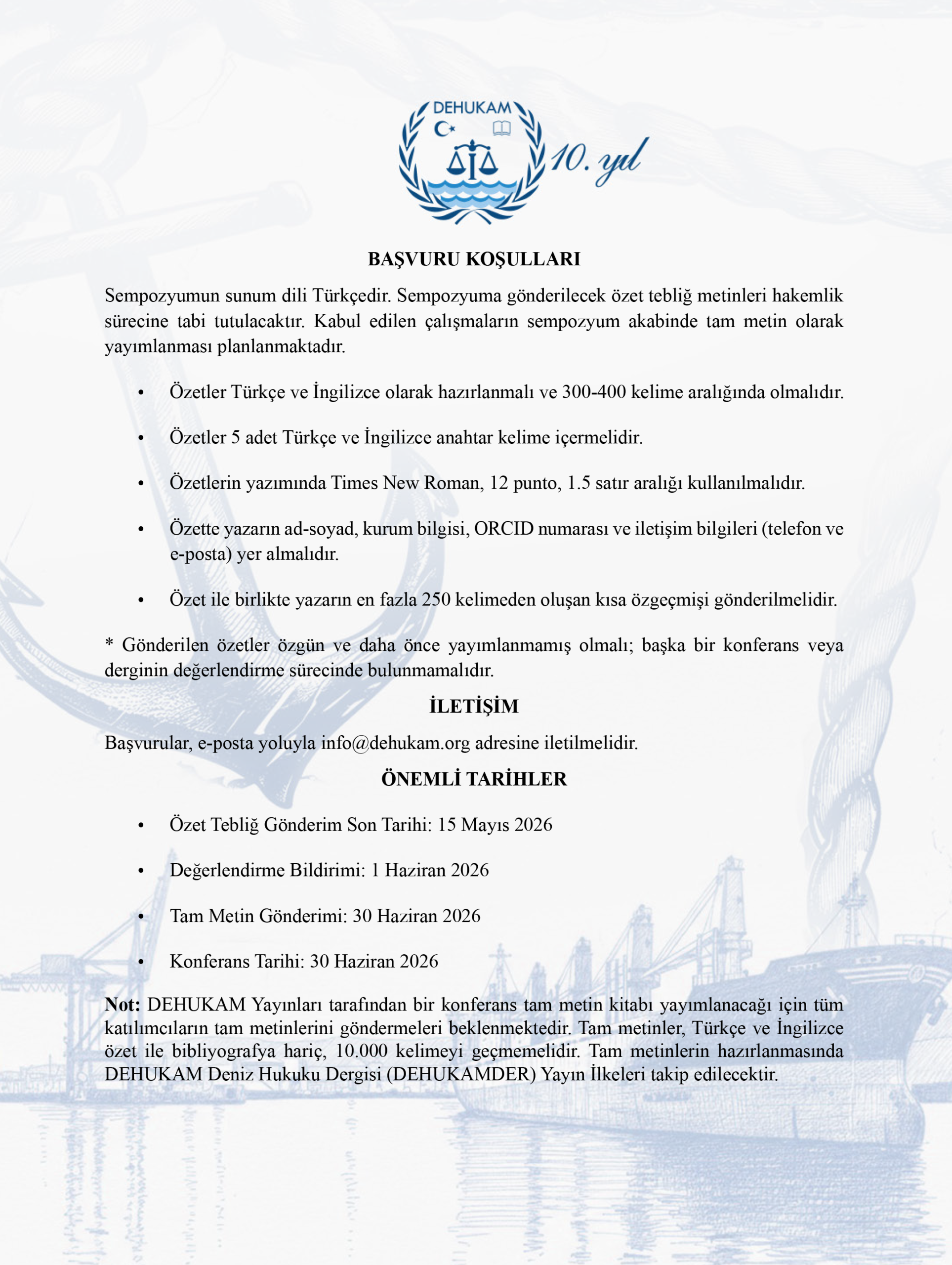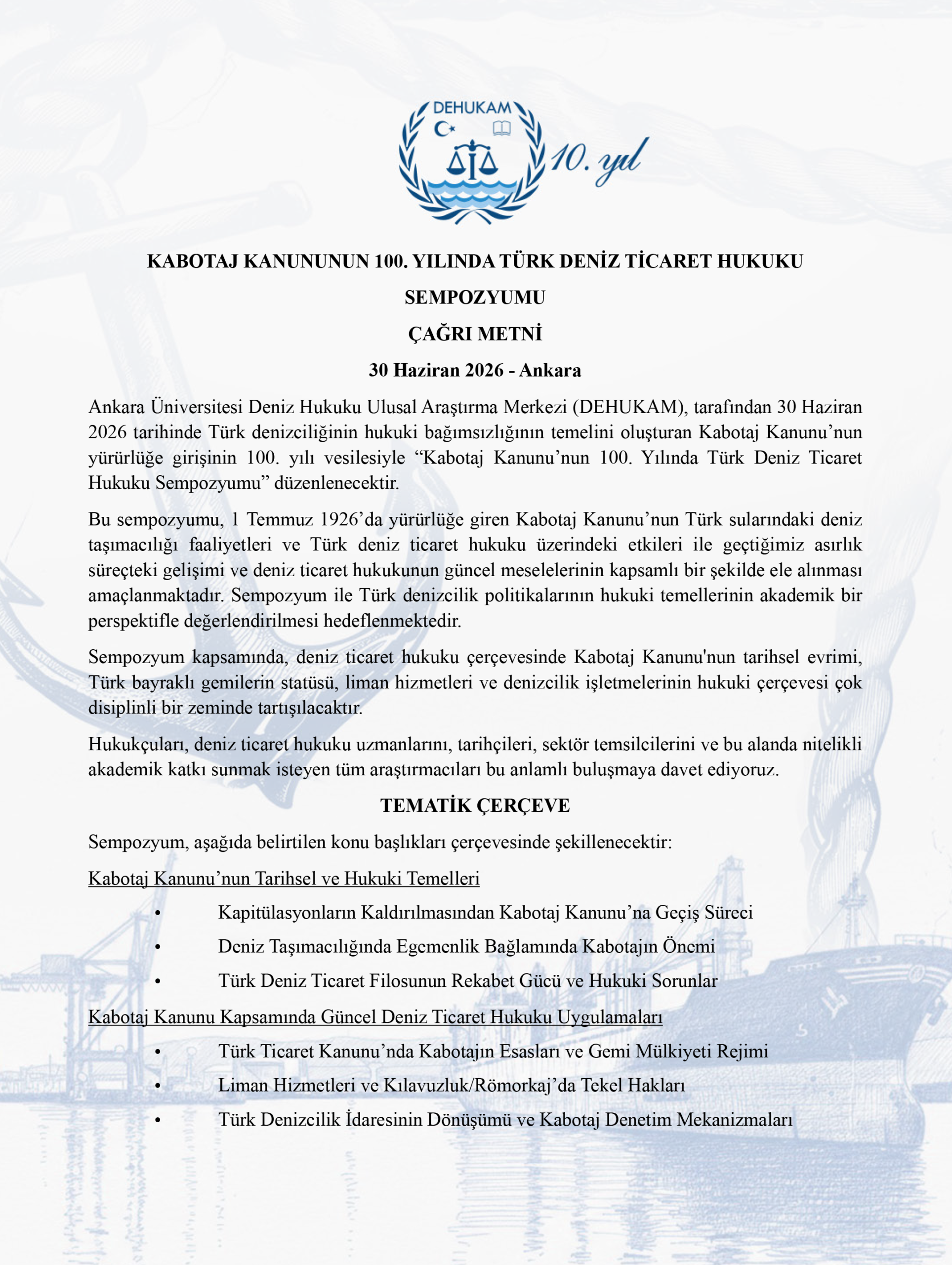 The Ankara University National Center for the Sea and Maritime Law (DEHUKAM) will hold a symposium titled “Turkish Maritime Commercial Law Symposium on the 100th Anniversary of the Cabotage Law” on 30 June 2026. The symposium, organized to mark the 100th anniversary of the Cabotage Law’s entry into force, will address the importance of the Cabotage Law for maritime transport in Türkiye and the current challenges facing Turkish maritime commercial law within the framework of this law. Details regarding the application process for the event are provided in the images.